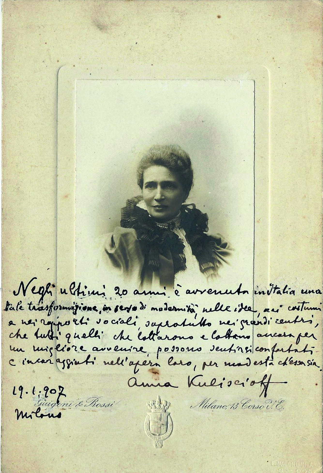 Si dice, ed è vero, che la bellezza è come una lettera di raccomandazione aperta. Anna Kuliscioff ha vissuto mille vite, certo, ebrezze e amarezze, momenti esaltanti e delusioni profonde, ma il suo ingresso sul proscenio della storia presenta anche questa, non secondaria, caratteristica. Lo scintillio della figura e lo charme innato di cui madre natura l’aveva dotata colpirono un po’ tutti quelli che ebbero modo di frequentarla. Per Filippo Turati «era bellissima, un’apparizione di luce». «Donna di un fascino irresistibile», nei ricordi del leader della socialdemocrazia tedesca Eduard Bernstein. Il rivoluzionario russo Leo Deutsch non aveva dubbi: «La sua bellezza e la sua eleganza producevano su tutti quelli che la incontravano un’impressione indimenticabile». A un processo a Firenze nel 1879 un cronista la descrisse così:. «Aveva poco più di vent’anni e pareva una vergine slava. Con una testa da madonna, con la carnagione bianca, con trecce lunghe di un biondo luminoso per le spalle, essa faceva pensare alle graziose figure dei preraffaelliti». Lapidario Cesare Lombroso, che la conobbe femme de trente ans: «La più bella donna d’Europa».