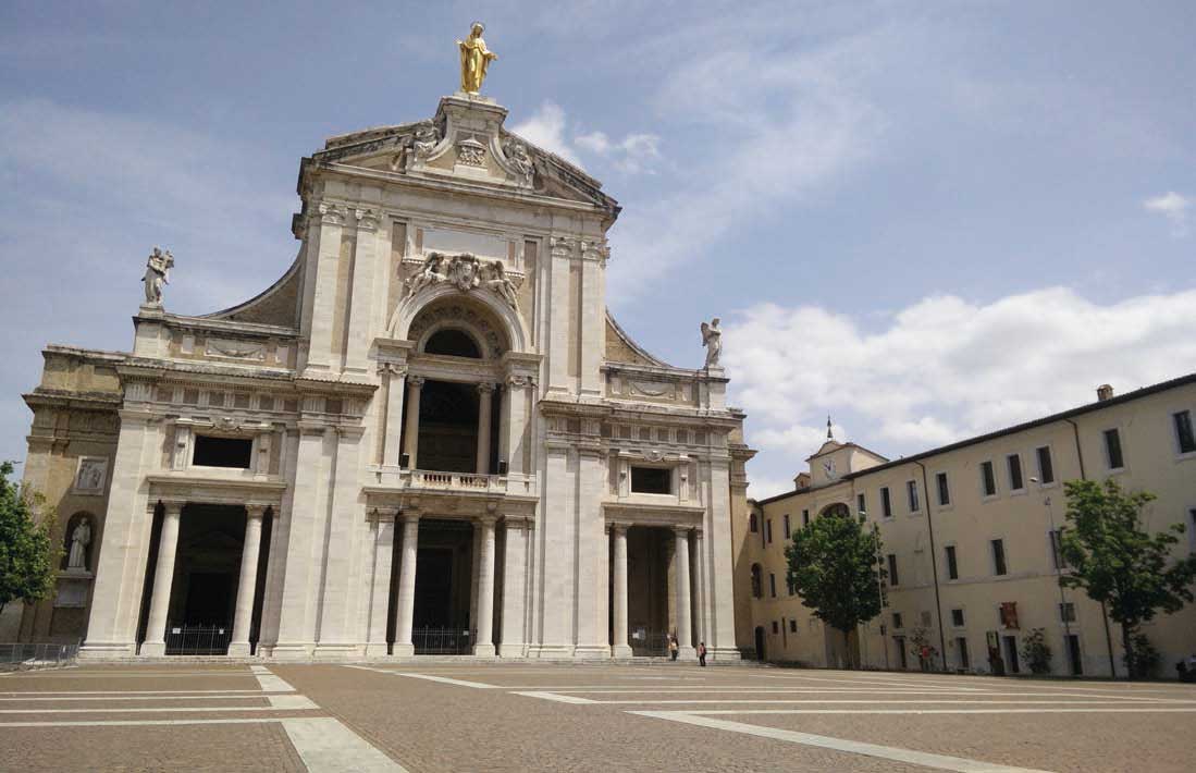 Percorrendo la piana che collega Perugia a Foligno il profi lo del Monte Subasio è una rassicurante sagoma panciuta che si alza tra le case di Assisi a occidente e Spello a oriente. Dalla strada, però, il primo piano architettonico non è quello delle basiliche che caratterizzano Assisi e neppure quello del declivio sul quale degrada Spello. La mole della grande cupola di Santa Maria degli Angeli troneggia su ogni altra sagoma circostante.
