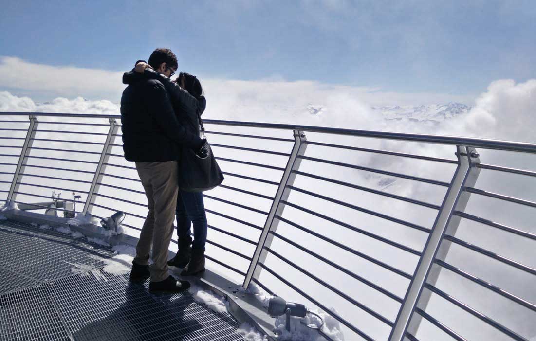 La struttura impressiona, per i tagli panoramici delle fi nestre, per le linee, per la piattaforma sommitale che lascia la sensazione di essere un’aquila sospesa tra le vette di fronte al Dente del Gigante, al Monte Bianco, al Monte Bianco di Courmayeur, al Les Dames Anglaises e, oltre la corona in primo piano, verso il Cervino, il Monte Rosa e il Gran Paradiso, ben riconoscibili anche grazie ai pannelli sinottici.