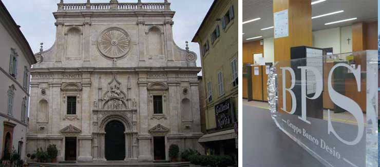 Camminando tra le viuzze del borgo, la facciata del tempio è una sorpresa che coglie impreparato chi non si aspetta una presenza così maestosa in una piazza tanto piccola. Impressiona perfino oggi che è momentaneamente protetta da un’impalcatura per i controlli seguiti al sisma dell’ottobre 2016.