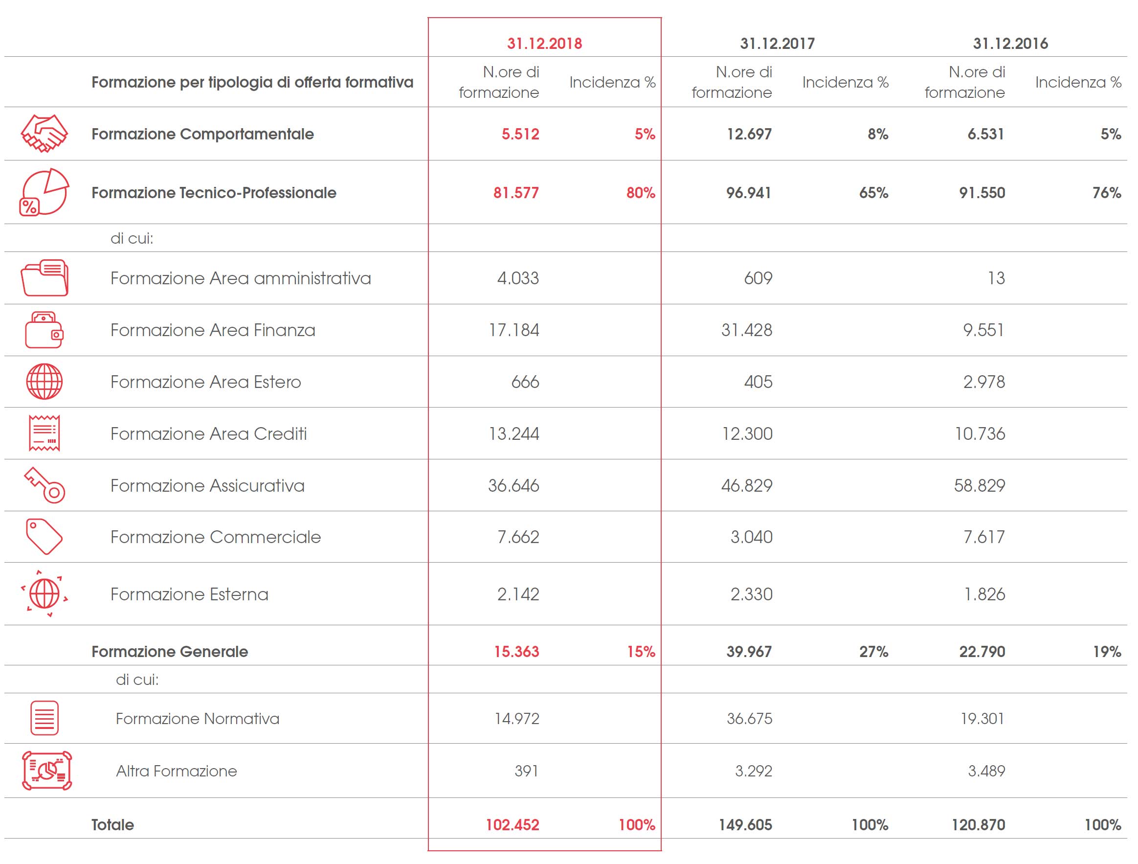 In particolare, in funzione delle linee guida strategiche del Piano Industriale di Gruppo 2018-2020 orientate ad un continuo efficientamento dei processi operativi a supporto dell’evoluzione del modello di business sono state erogate differenti attività formative, definitive in funzione delle specificità di contesto.