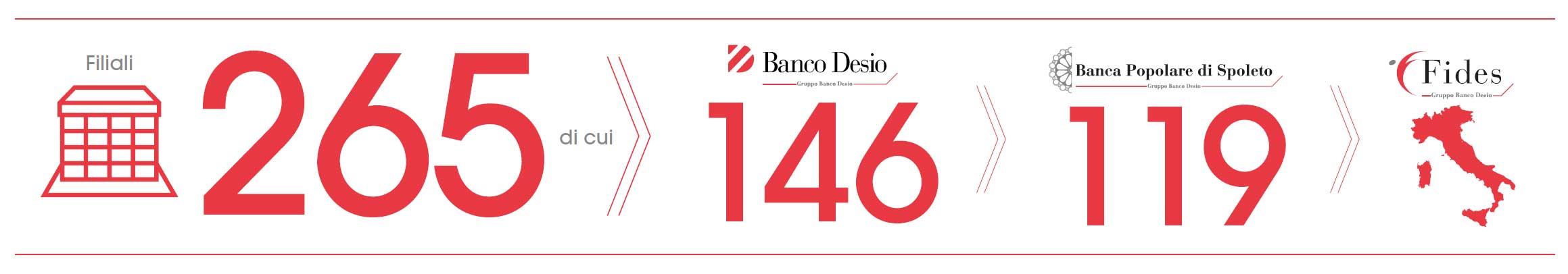 Il Gruppo opera attraverso una rete distributiva che al 31 dicembre 2018 consta di 265 filiali, di cui 146 della Capogruppo Banco di Desio e della Brianza e 119 della controllata Banca Popolare di Spoleto; la rete di agenti e mediatori, di cui si avvale la controllata Fides, su tutto il territorio nazionale, unitamente ai negozi dei mediatori monomandatari brandizzati Fides, consente di espandere le economie locali servite dal Gruppo.