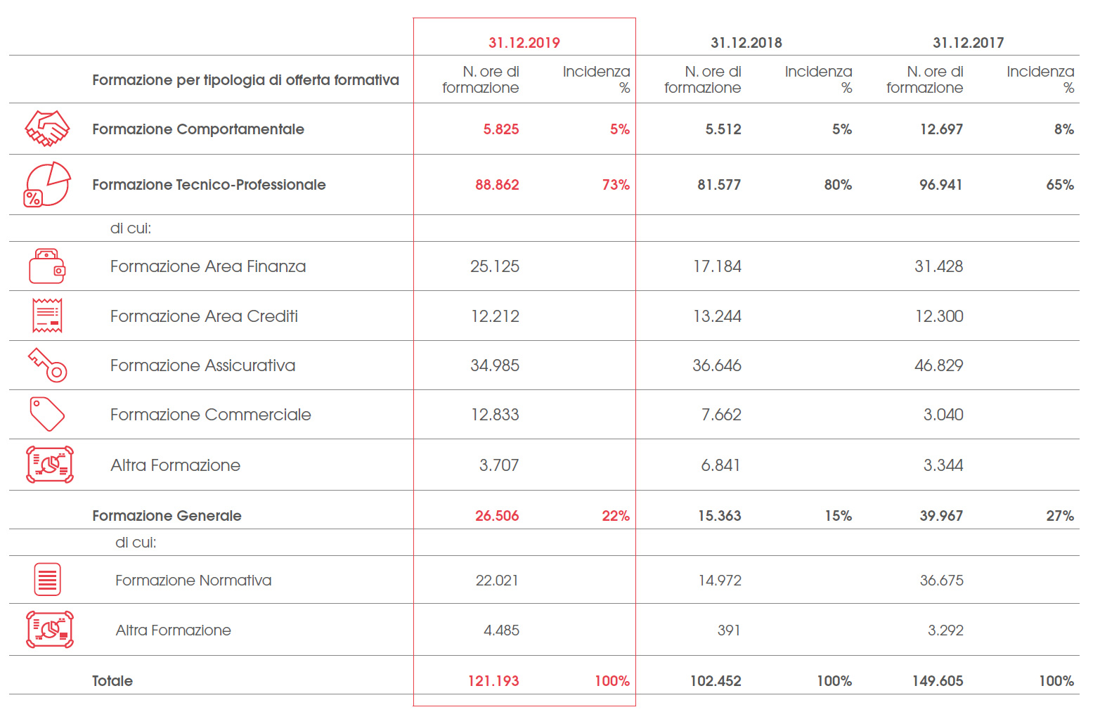 Nell’anno 2019 le attività formative hanno assunto una significativa rilevanza nell’ambito dei processi di sviluppo professionale delle risorse, accompagnando l’evoluzione di nuove expertise ed agevolando l’integrazione di differenti competenze in una prospettiva più allargata che afferma, nel continuo, cambiamenti non solo del contesto professionale, ma anche di quello sociale. Tale prospettiva si concretizza anche attraverso la progressiva introduzione di modalità flessibili di erogare formazione: in quest’ottica si evidenzia l’avvio dell’iniziativa di Smart Learning, intrapresa con la finalità di orientarsi sempre più verso strumenti di fruizione delle attività formative che agevolino la conciliazione delle esigenze lavorative con quelle familiari.