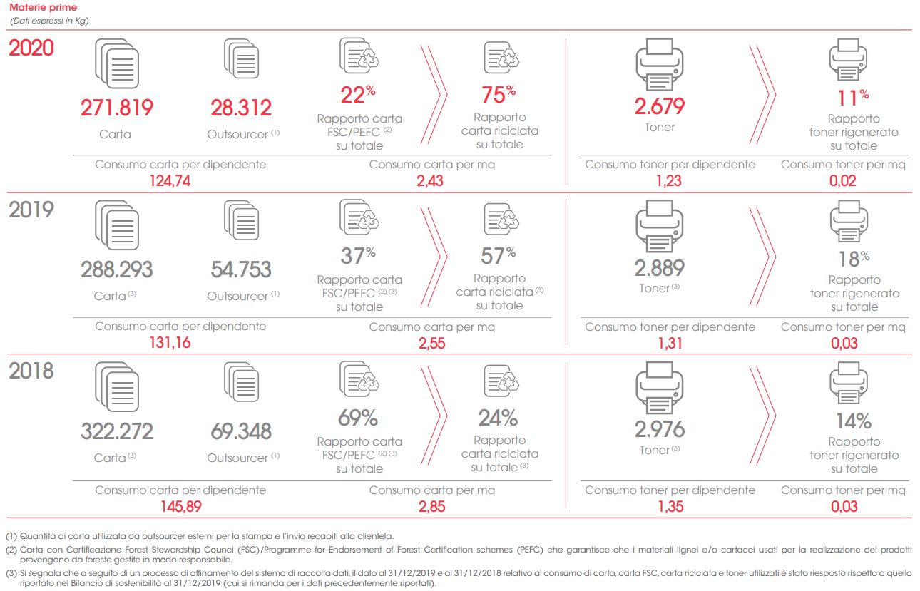 Il Gruppo si impegna a sviluppare iniziative volte alla riduzione del consumo di materie prime, tra le quali rilevano principalmente la carta e i toner, attraverso: